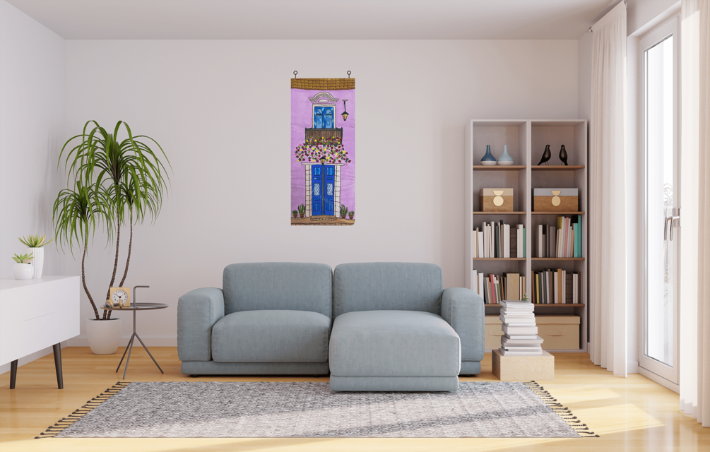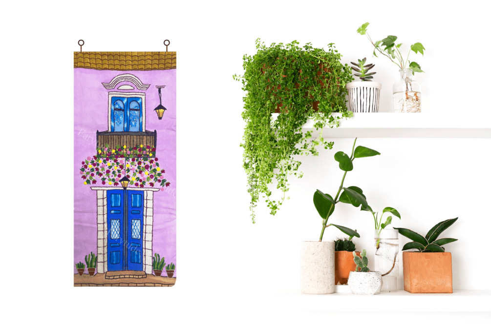 EMBROIDERED WALL HANGING DETAIL: This hand embroidered wall hanging illustrates a stunning house door and window adorned with colorful flowers. It would make a perfect addition to a front entrance to welcome your guests.