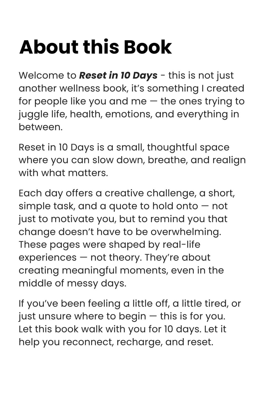 "Reset in 10 Days" blends daily wellness challenges, simple tasks, and uplifting quotes to help you reconnect with your body, calm your mind, and shift your routine. This book is especially helpful for: