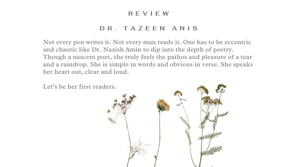 Not every pen writes it. Not every man reads it. One has to be eccentric and chaotic like Dr. Nazish Amin to dip into the depth of poetry. Though a nascent poet, she truly feels the pathos and pleasure of a tear and a raindrop. She is simple in words and obvious in verse. She speaks her heart out, clear and loud.